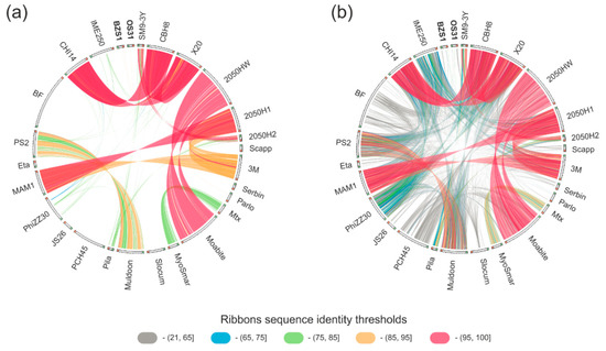 Comparison of BZS1 and OS31 with other Serratia phages. Similarities were based on nucleotide (a) and protein (b) all against all BLAST searches. Similarities are reflected by the ribbons connecting ideograms. Their colors reflect the scale of similarity between phage genome parts (a) or phage-encoded proteins (b), as indicated in the legend. The anchors of ribbons correspond to protein-encoding genes location. Green and orange rectangles at the ends of ideograms reflect the beginning and end of phage genome.