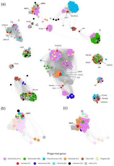 Protein-based phage similarity network. Phage genomes from NCBI were compared with BZS1 and OS31 phages with the application of vConTACT v0.93. On the network, only phages exhibiting similarity to Serratia phages were considered to yield a network of 1039 nodes – panel (a). In particular, phages showing similarity to BZS1 and OS31 phages were highlighted on panel (b,c), respectively. Node colors were used to indicate phage hosts according to the legend.