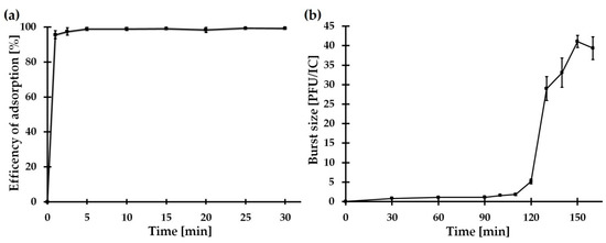 Phage BZS1 development. Adsorption of phage particles to the bacterial cells assessed after 1, 2.5, 5, 10, 15, and 30 min (a). One-step growth curve (b). Each data point represents the mean of three independent experiments.
