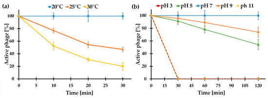 The BZS1 phage showed almost 100% stability under pH values ranging from 7.0 to 9.0, while the titers of the phage decreased with increasing acidity or basicity (Figure 7a). Moreover, BZS1 was very sensitive to temperature. The phage titer started to reduce at 25 °C (Figure 7b). Higher temperatures (over 40 °C) resulted in an immediate loss of activity. Although, the temperature stability of BZS1 seemed to not be high, it was adequate for the environment it originated from. The end and middle sections of Gertruda Adit of Zloty Stok mine (the place of biofilm sampling) were characterized by a stable air temperature of 10.4–11.1 °C and stable water temperature of 10–12 °C, throughout the year [93]. The pH of the Zloty Stok mine water was neutral (7.4–8.1) [93], thus, corresponding to the range tolerated by the virus.