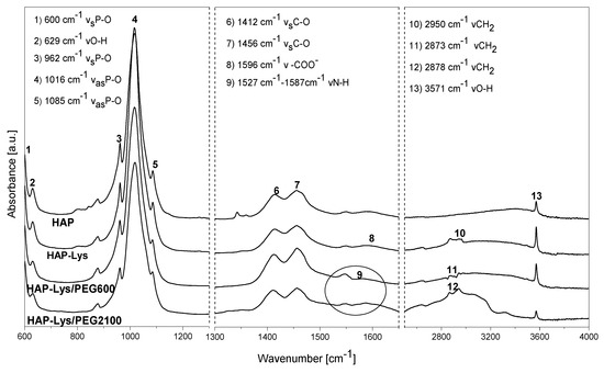 FTIR analysis. Figure 1 presents the attenuated total reflectance-Fourier transform infrared (ATR-FTIR) pectra of unmodified HAP particles, HAP with surface modified with l-lysine and HAP after PEG grafting. In the HAP spectrum, the intense bands at 1016 and 1085 cm−1 corresponded to P–O asymmetrical vibration modes (ν3). The doublet at 600 cm−1 was assigned to the P–O stretching mode (ν4). The weak band at 962 cm−1 corresponded to the stretching vibration mode (ν1) of the P–O bond in PO4− groups. The absorption bands observed at 3571 and 629 cm−1 corresponded to the stretching and deformation vibrations of O–H bonds in the hydroxyl groups of the crystalline phase of hydroxyapatite, respectively. The absorption band at approximately 3400 cm−1 and the wide and weak absorption band at approximately 1600 cm−1 were assigned to water adsorbed on the surface of the HAP. In the spectrum of HAP-Lys, the presence of bands at 2950 cm−1 from the alkane chain of l-lysine indicated the presence of an amino acid and the band at 1596 cm−1 confirmed the formation of carboxylate on the surface of HAP [15]. Moreover, the bands at 1575, 2873, and 2950 cm−1 (alkane chain of lysine) were shifted in the case of HAP-Lys compared to the position of pure l-lysine bands, indicating the existence of a weak interaction of l-lysine with HAP. The FTIR-ATR spectrum of pure l-lysine combined with FTIR-ATR spectra of HAP and HAP-Lys is presented in Figure S1 in the Supplementary Materials. For HAP particles after PEG grafting, the absorption bands at 2878 cm−1 (HAP-Lys/PEG2100) and 2873 cm−1 (HAP-Lys/PEG600) corresponded to the C–H stretching vibration mode of the alkanes group and indicated the presence of l-lysine and polyethylene glycol on the surface of HAP. The band at around 1262 cm−1 corresponded to C–O–C vibration from PEG. The formation of an amide bond in the reaction of the carboxyl end group of PEG and the first order amine group of l-lysine was confirmed by the characteristic second amide band in the range of 1587–1527 cm−1 from the deformation vibration of the N–H bond [15,20].