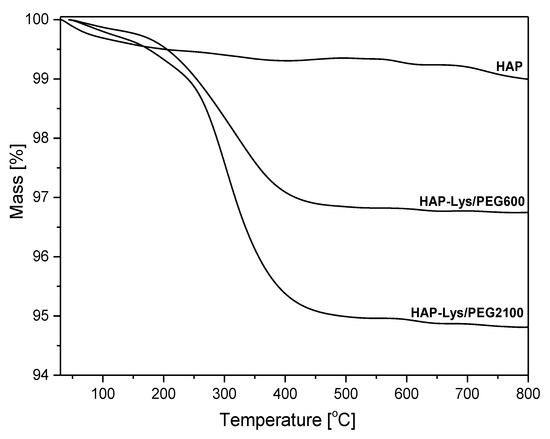 TGA analysis. The total amounts of grafted l-lysine and PEGs onto the HAP surface were determined by thermogravimetric analysis. According to the TGA curves presented in Figure 2, the weight losses at 800 °C of unmodified HAP and HAP modified with l-lysine/PEG600 and l-lysine/PEG2100 were 0.927%, 3.178%, and 5.007%, respectively. PEG600, PEG2100, and l-lysine degraded completely up to 800 °C (Figure S2 in the Supplementary Materials). The surface-grafted amount on the HAP surface was calculated from the residue at 800 °C considering the 0.927% of mass loss of HAP. The total grafting amount on HAP modified with l-lysine/PEG600 was found to be 2.251%, and 4.080% for HAP modified with l-lysine/PEG2100. This result further proved that l-lysine and PEG600/PEG2100 were successfully grafted onto the HAP surface. It also indicated the higher amount of grafted PEG2100 than PEG600. The estimated higher content of PEG2100 agreed with the amount assumed in the grafting procedure described in Section 3 and stemmed from the higher PEG2100 amount required for grafting than PEG600 with the maintained equal molar ratio.