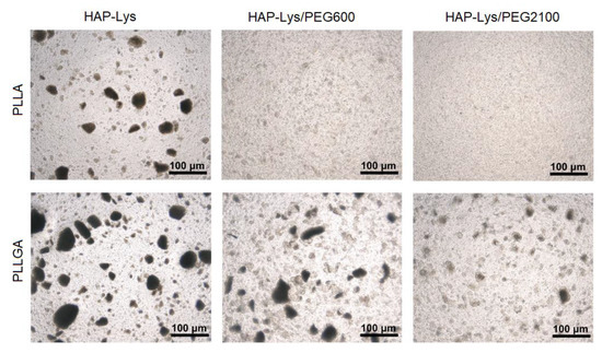 The composite samples were illuminated form the back side under an optical microscope. The same illumination conditions were applied for all the samples. In Figure 4, hydroxyapatite agglomerates can be seen with the size differing depending on the type of HAP surface modification and polymer used as the matrix. The brightness of agglomerates revealed their thickness. Surface modification of HAP-Lys particles with PEG improved the homogeneity of particle distribution in a polymer matrix and resulted in significant reduction of the dispersed agglomerate size. The improvement of homogeneity was more prominent in PLLA than in PLLGA. PEG2100-modified HAP-Lys produced a greater size reduction in hydroxyapatite agglomerates than PEG600 with the PLLA polymer, whereas for PLLGA, the influence of PEG molecular weight was not as perceptible.