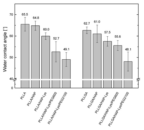 Water contact angle measurements are presented in Figure 5. The results revealed decreasing water contact angle of PLLA- and PLLGA-based composite films in the presence of filler particles in the following order: HAP, HAP-Lys, HAP-Lys/PEG600, and HAP-Lys/PEG2100. For neat PLLA, the water contact angle was 65.5 ± 3.2°C and decreased to 49.1 ± 3.3°C for PLLA/HAP-Lys/PEG2100. This represented an increase in hydrophilicity due to the hydrophilic mineral filler (water contact angle for HAP is ~10° [26]) and polyethylene glycol in composite films. The results indicated a significant improvement in wettability of PLLA- and PLLGA-based composites with PEG-modified HAP, which is important in terms of future application of the composites for bone regeneration.