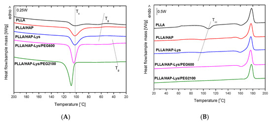 To investigate the effect of hydroxyapatite surface modification with l-lysine and polyethylene glycol on the thermal properties of PLLA- and PLLGA-based composites, DSC experiments were performed. The composite samples were first heated to 200 °C and maintained at 200 °C for 3 min under nitrogen to erase previous thermal history. The cooling DSC curves of the PLLA sample series are shown in Figure 6A, and the estimated thermal parameters are presented in Table 2. During cooling from the melt, PLLA underwent crystallization with an onset at 114.1 °C. The enthalpy of melt crystallization (ΔHc) occurring with a cooling rate of 5 °C/min had the lowest values for neat PLLA (11.8 J/g). In the presence of unmodified and l-lysine-modified hydroxyapatite particles, the enthalpy of melt crystallization increased; however, crystallization started 1.3 °C and 2.1 °C lower, respectively. In composites with HAP modified with PEG600 and PEG2100, the increase in ΔHc was much more prominent, 1.35 and 1.6 times higher than neat PLLA, respectively. For HAP modified with PEG2100, onset of melt crystallization (Tconset) moved about 1.5 °C higher, with a narrower temperature range of melt crystallization. These results indicated the nucleating activity of HAP modified with PEGs, with a higher efficiency of melt crystallization nucleation exhibited by HAP modified with PEG2100.