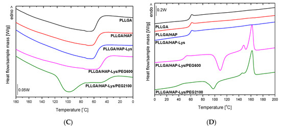 Cooling curves of PLLGA sample series are presented in Figure 6C. Neither HAP modified with PEG600 nor PLLGA and PLLGA with unmodified and l-lysine-modified HAP particles were able to crystallize from melt during cooling with the scanning rate employed (5 °C/min). The exothermic effect of melt crystallization was only visible for PLLGA/HAP-Lys/PEG2100, indicating the nucleation activity of HAP participles modified with PEG2100 on melt crystallization of PLLGA. HAP modified with PEGs caused a decrease of glass transition. PLLGA with HAP modified with PEG2100 exhibited a Tg about 17.7 °C lower (at 38.7 °C) than neat PLLGA. Plasticizing activity was also demonstrated by HAP modified with PEG600, but with lower efficiency than PEG2100; a decrease of Tg of about 9.4 °C was reached. The lowering of glass transition temperature by HAP modified with PEG600 and PEG2100 was confirmed by the second heating DSC curves (Figure 6D). PLLGA and PLLGA with unmodified and l-lysine-modified HAP particles did not crystallize on heating. The cold crystallization effect was visible for PLLGA with HAP modified with PEG600 and PEG2100. HAP modified with PEG600 did not exhibit nucleation activity on melt crystallization, but effectively nucleated the cold crystallization of PLLGA. A higher efficiency of cold crystallization nucleation was exhibited by HAP with PEG2100, as indicated by lower values of onset Tcconset as well as peak temperature Tcc of cold crystallization.