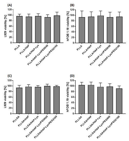 PLLA and PLGA have been considered as two of the most potent candidates for biomedical applications [31,32]. Due to their cytocompatibility, biodegradable properties, non-toxicity, and mechanical features, they are extensively used to fabricate tissue engineering scaffolds [33]. The biocomposites for medical applications destined for implantation or contact with tissue for long periods had to meet particular in vitro cytocompatibility criteria, even in the early stages of composite optimization (ISO 10993-5:2009). In this study, apart from standard L929 mouse fibroblasts, which are recommended by ISO standards, we used hFOB 1.19 human osteoblasts, that mimic the environment in which composites designed for bone regeneration stay in contact with. We found that the viability of target cells exposed to PLLA and PLLGA composites and their modifications remained at the same level as untreated controls. The results of the 3-(4,5-dimethylthiazol-2-yl)-2,5-diphenyltetrazolium bromide (MMT) reduction assay, which determines the metabolic function of cells by measuring the activity of mitochondrial dehydrogenase, showed that none of the PLLA- or PLLGA-based composites exhibited cytotoxicity after direct contact with these materials. As shown in Figure 7A, the viabilities of murine fibroblasts exposed to PLLA, PLLA/HAP, PLLA/HAP-Lys, and PLLA/HAP-Lys/PE600 were found to be 96.6% ± 6.8%, 94.6% ± 9.1%, 96.6% ± 8.4%, 92.4% ± 9.2%, and 98.6% ± 12.2%, respectively. The modifications of composites based on PLLGA (PLLGA, PLLGA/HAP, PLLGA/HAP-Lys, PLLGA/HAP-Lys/PEG600, and PLLGA/HAP-Lys/PEG2100) did not influence the viability of L929 cells (93.9% ± 8.4%, 97.6% ± 7.4%, 96.5% ± 5.1%, 99.9% ± 6.7%, and 98.3% ± 4.0%, respectively; Figure 7C). A similar effect was observed when hFOB 1.19 osteoblasts were exposed to PLLA-based composites (93.4% ± 22.5%, 95.2% ± 17.5%, 98.9% ± 17.0%, 93.2% ± 18.0% and 95.1% ± 16.9% for PLLA, PLLA/HAP, PLLA/HAP-Lys, PLLA/HAP-Lys/PEG600, and PLLA/HAP-Lys/PEG2100, respectively; Figure 7B) as well as PLLGA-based composites (103.6% ± 9.9%, 103.7% ± 10.5%, 97.0% ± 14.2%, 98.1% ± 10.2%, and 98.1% ± 9.3% for PLLGA, PLLGA/HAP, PLLGA/HAP-Lys, PLLGA/HAP-Lys/PEG600, and PLLGA/HAP-Lys/PEG2100, respectively; Figure 7D). All composites met the ISO criterion of maintaining the viability of at least 70% of cells exposed to the biomaterial for 24 h (ISO 10993-5:2009). A statistical analysis showed that modifications of PLLA-based and PLLGA-based composites did not affect the viability of target cells when compared with the physiological viability of control cell cultures. These results were in line with findings observed by other authors. Surfaces functionalized by arginine-glycine-aspartic acid and lysine-arginine-serine-arginine were found to support attachment, but did not enhance osteoblast differentiation or proliferation rate [34]. However, functionalization of surfaces with specific peptides, including l-lysine, may favor the attachment of osteoprogenitor cells and inhibit osteoblastic differentiation. The supporting impact of l-lysine on the attachment and viability of cells in the milieu of medical biomaterials was also proven. Recently, Castillo-Cruz et al. developed a Lys-based hydrogel that enhanced cell adhesion due to lysine residues. It was observed that the attachment of cells to lysine-modified hydrogel was five times more effective, compared with a poly-l-lysine coating. The interaction between the biomaterial and the cells might occur through electrostatic interaction between the positive charge from –NH3+ and negatively charged substances on the cell surface such as glycosaminoglycans [35,36]. The synergistic role of l-lysine and hydroxyapatite in osteoblast healing processes was also reported [11]. The results presented here as well as findings of other groups suggests that PLLA and PLGA with l-lysine modified hydroxyapatite support the cytocompatibility of composites, and that the biological activity remains when facilitating the adhesion process, which drives regeneration rather than cell proliferation or metabolic activity.