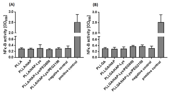 Results obtained in the immunocompatibility in vitro assay using THP1-BlueTM cells showed that PLLA- and PLLGA-based composites did not stimulate human monocytes (Figure 8). The obtained values of secreted embryonic alkaline phosphatase (SEAP) concentrations remained on the level of unstimulated cultures (0.308 ± 0.07). Thus, SEAP production by monocytes in response to PLLA, PLLA/HAP, PLLA/HAP-Lys, and PLLA/HAP-Lys/PE600 was 0.286 ± 0.03, 0.284 ± 0.02, 0.308 ± 0.115, 0.266 ± 0.02, and 0.287 ± 0.03, respectively. Similarly, the PLLGA composites (PLLGA, PLLGA/HAP, PLLGA/HAP-Lys, PLLGA/HAP-Lys/PEG600, and PLLGA/HAP-Lys/PEG2000) did not activate monocytes to induce NF-kB transcription factor (0.299 ± 0.03, 0.289 ± 0.05, 0.295 ± 0.05, 0.372 ± 0.03, and 0.375 ± 0.04, respectively). In comparison, strong activation of THP1-Blue™ NF-κB monocytes was observed in cultures stimulated with lipopolysaccharide (LPS) Escherichia coli (100 ng/mL), which is a well-established bacterial stimulus (2.52 ± 0.360).