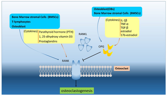 The RANKL/OPG/RANK (receptor activator of NF-kappa B ligand/osteoprotegerin/receptor activator of NF-kappa B) are secreted and regulated by various cells and different cytokines. The RANKL and OPG can be produced by bone marrow stromal cells (BMSCs) and osteoblasts (OBs) to interact or compete RNAK in osteoclast and osteoblast. The OPG can regulated by cytokines, like interleukin (IL)-1β, tumor necrosis factor (TNF)-α, TGF-β, estradiol, and 17b-estradiol.