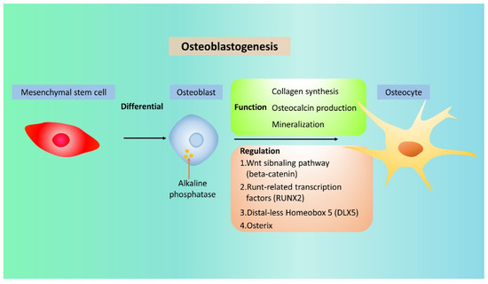 OBs are mononuclear cells originating from mesenchymal stem cells and evolve into osteocytes or bone-lining cells by specific steps [32]. They contain the enzyme alkaline phosphatase for bone formation, which can also be used as a marker of OB activity [33]. They are normally located on the bone surface and lay down new bone [34]. Through collagen formation and the production of osteopontin and osteocalcin, they mineralize the bone matrix and solidifies the bone. The specific differentiation steps of OBs are modulated by the time-dependent expression of transcription factors, such as Runt-related transcription factor 2 (RUNX2), Distal-Less Homeobox 5 (DLX5), and osterix, in the osteoblastogenesis process [32] (Figure 2). Osteoblastogenesis relies on the balance of agonist and antagonist activity of the Wnt signaling pathway, which regulates the expression of the transcription factor beta-catenin [35]. After new bone formation, OBs may serve as lining cells on the bone surface, become osteocytes, embed itself into the mineralized matrix, or simply undergo apoptosis [36].