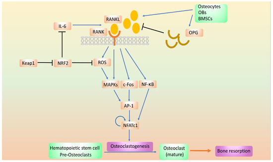 The role of NRF2 in regards to OBs may also be related to the level of intracellular ROS, as a higher level of ROS has been observed in NRF2 deficient OBs and stromal cells. This increased level of oxidative stress from elevated ROS levels results in the inhibition of OB differentiation [121]. NRF2 levels in OBs also interact with osteoclastogenesis because a decrease in ROS levels by NRF2 activation leads to a reduction in RANKL, which inhibits OC activity and osteoclastogenesis [121]. NRF2 activation also reduced IL-6 secretion, leading to suppression of osteoclastogenesis [122]. Therefore, it is presumed that the activated NRF2 could promote osteoblastogenesis and suppress osteoclastogenesis.