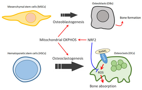 HSCs, another major stem cell population in bone, participates in bone remodeling by differentiating into OCs. Similar to osteoblastogenesis, OC differentiation is accompanied by remarkable mitochondria increase and upregulation of mitochondrial metabolism [160]. Impairment of mitochondrial respiration by knocking out of mitochondrial complex I subunit Ndufs4 inhibits osteoclastogenesis and leads to osteopetrosis [161]. However, in contrast to osteoblastogenesis, knockdown of SOD2 both in vitro and in vivo increases mitochondrial ROS production and leads to accelerated osteoclastogenesis and reduction of bone volume [162]. Accumulating evidence supports that ROS are essential regulators of OCs lineage commitment from HSCs [102,163]. In the light of these findings, NRF2 clearly regulates mitochondrial function and ROS production in a sophisticated manner during osteoclastogenesis. Furthermore, NRF2 might also promote HSC lineage allocation toward OCs through regulating mitochondria biogenesis and mitochondrial quality, while restrain OCs from hyper-activation by fine-tuning ROS production.