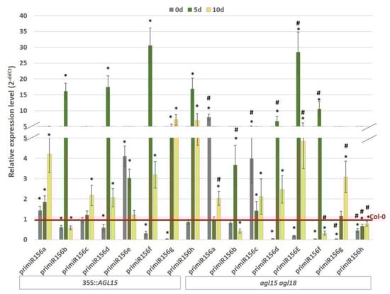 Relative expression level of pri-miR156s in the embryogenic cultures of the 35S::AGL15 and agl15 agl18 transgenic lines. The relative miRNA level was normalised to an internal control (At4g27090) and calibrated to a Col-0 culture of the same age. * value significantly different from the Col-0 culture of the same age (p < 0.05; n = 3 ± SD); # value significantly different from the 35S::AGL15 culture of the same age (p < 0.05; n = 3 ± SD).