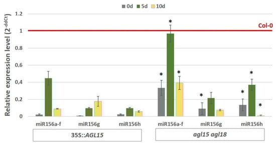 The role of AGL15 in the activation of two MIR156 genes (MIR156a and c) during flowering [21] motivated us to gain insights into the regulatory relationship between AGL15 and miR156 in SE induction. To this end, the abundance of the primary miR156 transcripts (pri-miR156) of eight MIR156 (MIR156a–h) genes that are present in the Arabidopsis genome was analysed in cultures that had different AGL15 expression levels, including WT (Col-0), 35S::AGL15, and agl15 agl18. The results showed that there was no relationship between the AGL15 expression level and the transcription of seven of the MIR156 genes (MIR156a–g) and that both the overexpression (35S::AGL15) and knock-out mutation (agl15 agl18) resulted in a significant increase in pri-miR156a-g (Figure 1). By contrast, pri-miR156h had a high (up to 15-fold) up-regulation in response to the overexpression of AGL15 and a distinct downregulation (up to two-fold) in the agl15agl18 mutant culture, which suggests that AGL15 might positively regulate MIR156h during SE induction.
