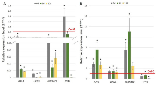 Relative expression level of the miRNA biogenesis genes (DCL1, HEN1, SERRATE and HYL1) in the embryogenic cultures of the 35S::AGL15 (A) and agl15 agl18 (B) transgenic lines. The relative expression level was normalised to an internal control (At4g27090) and calibrated to the Col-0 culture of the same age. * value significantly different from the Col-0 culture of the same age (p < 0.05; n = 3 ± SD).