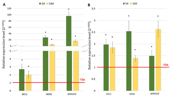 Relative expression level of the miRNA biogenesis genes (DCL1, HEN1, SERRATE) in the embryogenic cultures of the 35S::AGL15 (A) and agl15 agl18 (B) transgenic lines that had been treated with a TSA (Trichostatin A). The relative expression level was normalised to an internal control (At4g27090) and calibrated to the untreated culture of the genotypes of the same age. * value significantly different from the culture of the same age untreated with a TSA (p < 0.05; n = 3 ± SD).
