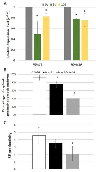 Expression analysis of HDAC6 and HDAC19 (A) in the SE culture of the Col-0 genotype. Capacity for SE in the cultures of the hdac6 and hdac6 hdac19 mutants and their parental genotype, Col-0. Percentage of explants producing somatic embryos (B) and SE productivity (C) of the IZE explant culture that was induced on an E5 medium. The relative transcript level was normalised to an internal control (At4g27090) and calibrated to freshly isolated explants (0d). * value significantly different from the freshly isolated explants (0d) (p < 0.05; n = 3 ± SD); # values significantly different from the Col-0 (p < 0.05; n = 3 ± SD).