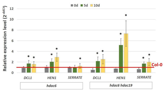Relative expression of the miRNA biogenesis genes (DCL1, HEN1, SERRATE) in the SE cultures of the hdac6 and hdac6 hdac19 mutant lines. The relative transcript level was normalised to an internal control (At4g27090) and calibrated to the Col-0 culture of the same age. * values significantly different from the Col-0 culture of the same age (p < 0.05; n = 3 ± SD).