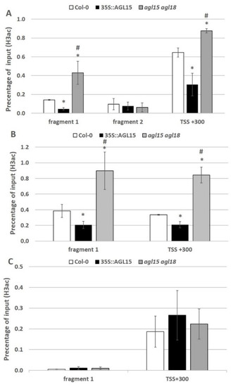 H3ac enrichment in a selected fragment of a promoter and TSS + 300 of the DCL1 (A), SERRATE (B) and HEN1 (C) genes in the explants of the Col-0, 35S::AGL15 and agl15 agl18 lines. * value significantly different from the Col-0 (p < 0.05; n = 3 ± SD); # value significantly different from the 35S::AGL15 (p < 0.05; n = 3 ± SD).
