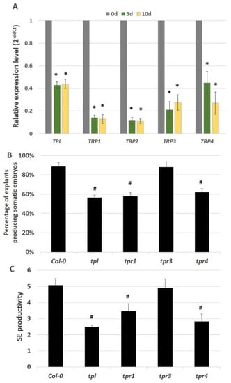 Relative expression level of the genes encoding the TOPLESS co-repressors (TPL, TPR1-4) in the embryogenic culture of Col-0 (A). Capacity for somatic embryogenesis in the cultures of mutants in the TOPLESS co-repressor genes (tpl, tpr1, 3, 4) and their parental genotype, Col-0. Percentage of explants producing somatic embryos (B) and SE productivity (C) of the IZE explant culture that was induced on an E5 medium. The relative expression level was normalised to an internal control (At4g27090) and calibrated to freshly isolated explants (0d). * value significantly different from the freshly isolated explants (0d) (p < 0.05; n = 3 ± SD); # values significantly different from Col-0 (p < 0.05; n = 3 ± SD).
