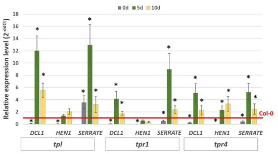 Next, we assumed that the TPLs might impact the miRNA biogenesis genes in an embryogenic culture and the expression of DCL1, HEN1, and SERRATE in the tpl, tpr1 and tpr4 mutants was analysed in order to verify this hypothesis. The analysis showed that two of the miRNA biogenesis-related genes DCL1 and SERRATE, were significantly up-regulated in the embryogenic-induced explants of all three (tpl, tpr1, and tpr4) mutants (Figure 9). By contrast, there was a substantial increase of the HEN1 transcripts exclusively in the tpr4 mutant culture, which suggests that different TPL co-repressors might be involved in the control of distinct miRNA biogenesis genes in an embryogenic culture.