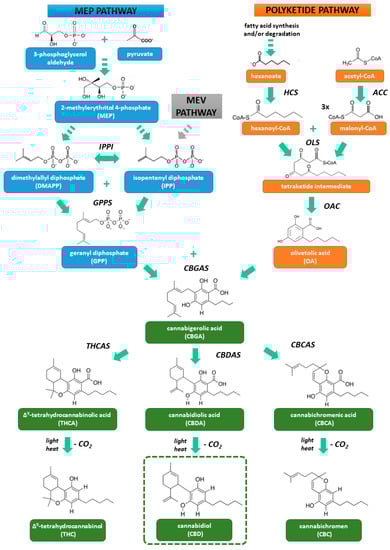 The biosynthesis of phytocannnabinoids (Figure 1) starts with the synthesis of two precursor compounds—geranyl diphosphate (GPP) in the 2-methylerythritol 4-phosphate (MEP) pathway and olivetoleic acid (OA) in the polyketide pathway. The terpene moiety of cannabinoids comes from GPP which is formed through condensation of isopentenyl diphosphate (IPP) and dimethylallyl diphosphate (DMAPP) catalysed by GPP synthase [1,42]. IPP and DMAPP are isomeric (they undergo mutual transformation under the influence of IPP isomerase), and are synthesized in plastids via the MEP pathway. Pyruvate and 3-phosphoglycerol aldehyde are MEP precursors. The cytosolic mevalonic acid (MEV) pathway can also be a source of IPP and DMAPP, but for cannabinoid synthesis this is likely to be minor [42,43]. The second important precursor of cannabinoids is OA responsible for their phenolic moiety. It is formed as a result of aldol condensation of hexanoyl-CoA with three molecules of malonyl-CoA, and for this transformation two enzymes are necessary—olivetol synthase and olivetolic acid cyclase acting on the resulting tetraketide intermediate product. Hexanoyl-CoA is the product of a reaction between hexanoate (formed by biosynthesis and/or degradation of fatty acids) and CoA, catalysed by synthetase of hexanoyl-CoA. Malonyl-CoA, on the other hand, is a product of acetyl-CoA carboxylation by acetyl-CoA carboxylase [42].
