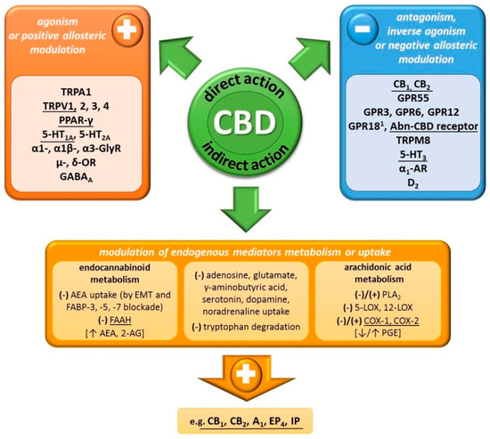 Multiple studies have shown that CBD has many effects independent of direct or indirect interaction with CB1/CB2 receptors. The agonistic action of the CBD has been demonstrated at the following: transient receptor potential ankyrin subfamily member 1 (TRPA1) and vanilloid subfamily members 1–4 (TRPV1–4), peroxisome proliferator-activated receptor γ (PPARγ), orphan G-protein coupled receptor—GPR18 (CBD is a partial agonist but antagonizes THC effects) and serotonin 5-HT1A and 5-HT2A receptors (partial agonist). Moreover, CBD is a positive allosteric modulator of α1-, α1β- and α3-glycine receptors (α1-, α1β- and α3-GlyR), μ- and δ-opioid receptors (μ- and δ-OR) and γ-aminobutyric acid receptor type A (GABAA). In contrast, CBD shows antagonistic activity at the orphan receptor GPR55 (even postulated as CB3 receptor), the putative receptor for abnormal-cannabidiol (Abn-CBD; see below) and the transient receptor potential melastatin subfamily member 8 (TRPM8). Moreover, it is a negative allosteric modulator of serotonin 5-HT3 receptor, α1-adrenergic receptor (α1-AR) and dopamine D2 receptor [11,17,21]. Recently it has also been shown that CBD is an inverse agonist for orphan receptors GPR3, GPR6 and GPR12 [13].