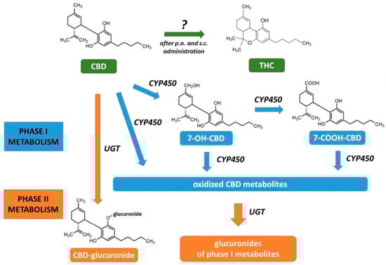 Metabolism of cannabidiol [59,60,61,62,63,64,65,67,68]. Abbreviations: 7-COOH-, 7-OH-CBD:7-Carboxy-, 7-hydroxycannabidiol; CBD: Cannabidiol; CYP: Cytochrome P450; p.o.: Per os, orally; s.c.: Subcutaneously; THC: Δ9-Tetrahydrocannabinol; UGT: UDP-Glucuronosyltransferase.