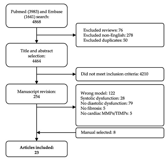 We retrieved 23 relevant studies via our systematic search, complemented by cross-referencing. In order to exclusively include models with well-established phenotypic characterization, we applied stringent inclusion criteria. These included established echocardiographic measurements of diastolic function in absence of systolic dysfunction, combined with quantification of fibrosis and cardiac tissue quantification of at least one MMP or TIMP, and only in pre-determined experimental models known to represent co-morbidities in human HFpEF. Inclusion of stable LVDD/HFpEF models came at the cost of the relatively low power of our meta-analysis. Our broad search strategy was performed in two biomedical databases, leading to a large number of references. Several papers did not explicitly mention either LVDD/HFpEF or MMP/TIMP expression while focusing on disease development or only retrieved MMPs/TIMPs by applying an mRNA-sequencing protocol. Consequently, these studies could not be identified by our search, but we have resolved this by cross-reference searching.