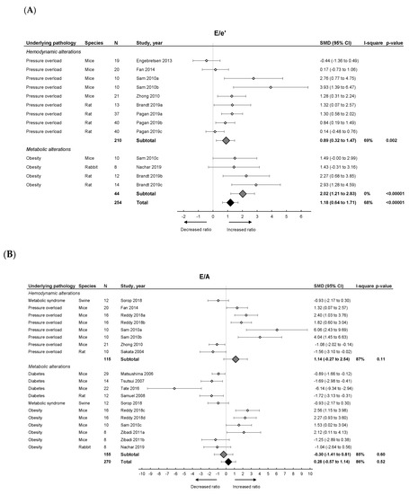 Figure 2. The effect of LVDD/HFpEF on cardiac parameters E/e’ (panel (A)) and E/A (panel (B)). Forrest plot; the right side shows an increased ratio in LVDD/HFpEF animals, the left side shows a decreased ratio in LVDD/HFpEF animals. Data are presented as standard mean differences (SMDs) with 95% CI. Arrows indicate increased and decreased E/e’ ratio (A), and increased and decreased E/A ratio (B) respectively. Only the first author of each study is shown; multiple comparisons within one study are shown with a, b, c or d and correspond with the study overview (Table S1). CI, confidence interval; E/A, ratio between peak early diastolic transmitral velocity (E) and late (atrial) transmitral flow velocity (A); E/e’, ratio between peak early diastolic transmitral velocity (E) and early diastolic mitral annular velocity (e’); I2, measurement of heterogeneity; N, cumulative sample size; SMD, standardized mean difference.