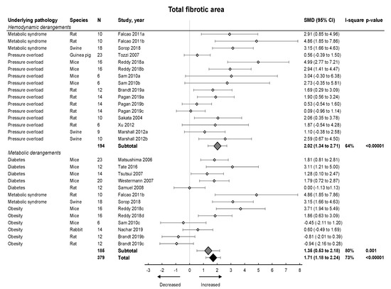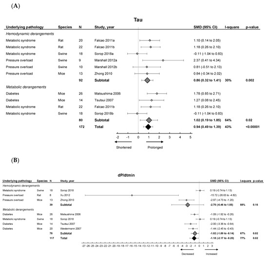 Invasive hemodynamics were less frequently applied in the included articles, probably due to practical constraints, especially in small animals. In pooled data, we did find prolonged Tau and decreased dP/dtmin, which were both identified in metabolic alterations, in accordance with literature [72,73].