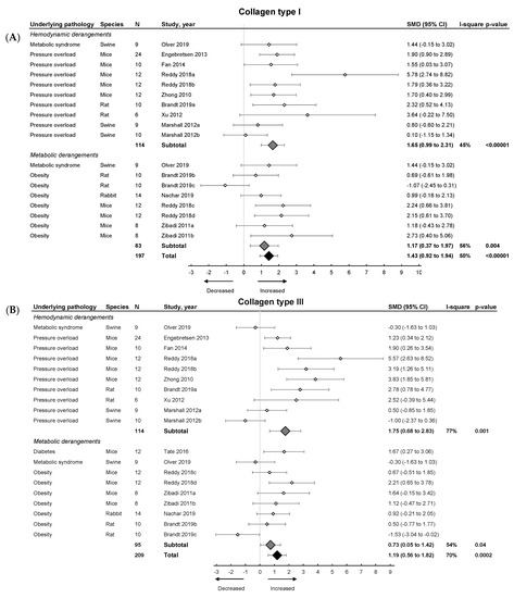 Subsequently, we focused on fibrosis. An overview of meta-analyses outcomes for fibrosis can be found in Table 1 and Table S6. Note the relative paucity of data on collagen protein as compared to mRNA levels (Table S6). Meta-analysis on positive percentage area as assessed by IHC showed a pooled increase (Figure 4). Both hemodynamic and metabolic models were associated with an increase, without subgroup differences (p = 0.22), resulting from increased collagen type I expression (mRNA and protein) and increased collagen type III on mRNA but not protein level (Figure 5A,B).