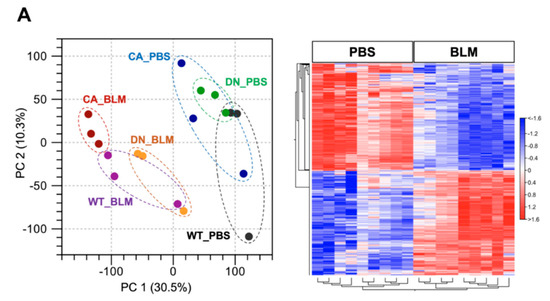 Expression profiling of BLM- and PBS-treated lungs in three different mouse genotypes. Three samples from each group were sequenced. (A) Principal component analysis of RNA sequencing datasets among the BLM- and PBS-treated three mouse groups (left). Hierarchical clustering shown in a heatmap of gene expression profiles between the BLM- and PBS-treated groups (right). The red and blue strips represent upregulated and downregulated genes in each group, respectively. (B) Gene set enrichment analysis of differential expression in the p38 MAPK pathway between the BLM- and PBS-treated groups of three mouse genotypes. The normalized enrichment scores (NES), normal p-values, and false discovery rate (FDR) q values are indicated. (C) Volcano plot of differentially expressed genes altered by BLM treatment among three mouse groups. Upregulated and downregulated genes are discriminated based on log2 fold-change and adjusted FDR p-value (<0.05).