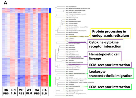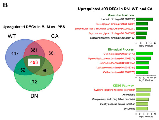 Gene ontology (GO) and Kyoto Encyclopedia of Genes and Genomes (KEGG) pathway enrichment analysis of differentially expressed genes (DEGs) altered by BLM treatment among three mouse groups. (A) K-means clustering shown in a heatmap based on the gene expression profiles between the BLM- and PBS-treated groups of three mouse genotypes (left). The colored bars on the right of the diagram indicate clusters. The trees represent enriched KEGG pathways corresponding to each cluster (right). (B) Venn diagram showing the overlap of DEGs upregulated by BLM among three mouse groups, with the numbers of DEGs indicated in each area (left). GO and KEGG pathway enrichment analysis of 493 common upregulated DEGs among the three genotypes (right). Top five enriched GO terms associated with molecular function (upper) and biological process (middle), and KEGG pathway analysis (bottom).