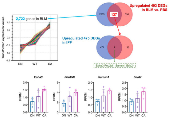 To identify the pathogenetically relevant genes in the progression of IPF, we investigated the correlation of upregulated genes between BLM-induced fibrotic lungs showing the three different severity levels and human IPF lungs (Figure 4). In the BLM-treated groups, K-means clustering analysis identified a cluster of 2722 genes that their mean reads per kilobase of exon per million mapped sequence reads (RPKM) values increased along with stepwise elevation of p38 signaling in the lungs (Supplementary Table S6). We verified 137 DEGs that were included in this cluster and upregulated in common with the three BLM-treated mouse groups. Additionally, human RNA-seq data that provided 475 upregulated DEGs in IPF lung tissue compared to healthy lung tissue was obtained from the Gene Expression Omnibus website (accession ID: GSE52463). Finally, comparison of our data with human RNA-seq data identified four overlapping DEGs; namely, EPH receptor A3 (EPHA3), POU class 2 homeobox associating factor 1 (POU2AF1), SAM domain, SH3 domain and nuclear localization signals 1 (SAMSN1), and ectodysplasin A2 receptor (EDA2R).