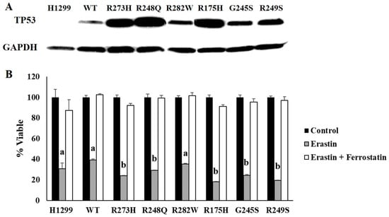 TP53 mutation status influences ferroptosis sensitivity. H1299 (TP53 null) cells were transfected with either a tetracycline inducible wild-type (WT) TP53 or a representative contact (273H, 248Q, 282W) or conformational (175H, 245S, 249S) mutant TP53. (A) Tetracycline-inducible expression of WT and mutant TP53 expression was confirmed by Western blot. Glyceraldehyde 3-phosphate dehydrogenase (GAPDH) was used as a loading control. (B) Cell viability measured following 24 h of treatment with DMSO (Control), 10 µM erastin, or 10 µM each of erastin and ferrostatin-1 (n = 4 per cell type and treatment group). Superscripts (a,b) denote statistical significance, p < 0.05. Treatments that share the same superscripts are not significantly different. Error bars indicate SEM.
