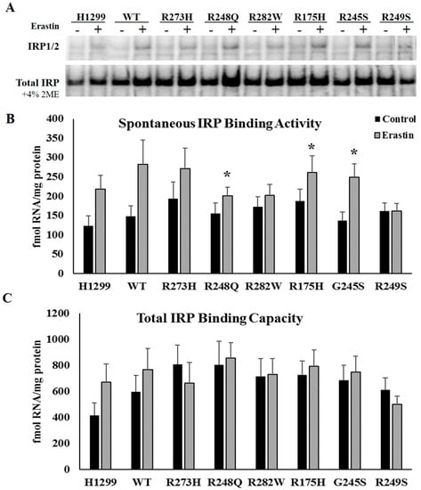 We have previously established that induction of distinct TP53 mutation types differentially influences IRP RNA binding activity and diminishes IRP responsiveness to changes in cellular iron availability []. As such, we hypothesized that mutant TP53-dependent differences in ferroptosis sensitivity might be influenced by mutant TP53-dependent differences in IRP RNA binding activity in response to erastin treatment. To examine the impact of ferroptosis induction on IRP function and expression, we quantitatively assessed spontaneous mRNA binding activity and total IRP mRNA binding capacity through an electrophoretic mobility assay (EMSA). Spontaneous IRP binding measures the amount of IRP1 and IRP2 in their active RNA binding forms under the specified control or treatment conditions. As iron-mediated lipid peroxidation is critical for ferroptosis induction [], we hypothesized that spontaneous IRP mRNA binding activity would be increased in response to erastin treatment. However, despite upward trends in the TP53 null, WT TP53, and R273H TP53 mutants, only cells expressing the R248Q (p = 0.019), R175H (p = 0.015), and R245S (p = 0.027) TP53 mutation types exhibited statistically significant increases in spontaneous IRP RNA binding activity following erastin treatment (Figure 2A,B). Thus, erastin-mediated increases in IRP RNA binding activity cannot fully explain the increased sensitivity to ferroptotic cell death in all mutant TP53-expressing cell types.
