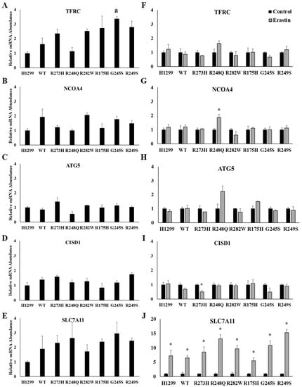 Iron-uptake and ferritinophagy-related gene expression are not affected by TP53 mutation status or erastin treatment. Relative mRNA expression of (A) transferrin receptor 1 (TFRC) (B) nuclear receptor coactivator 4 (NCOA4), (C) autophagy related 5 (ATG5), (D) CDGSG iron sulfur domain 1 (CISD1), and (E) solute carrier family 7 member 11 (SLC7A11) in TP53 null H1299 cells (H1299) or H1299 cells transfected with wild-type (WT) TP53, or the indicated TP53 mutant (n = 3 per cell type and treatment group). Relative mRNA expression of (F) TFRC, (G) NCOA4, (H) ATG5, (I) CISD1, and (J) SLC7A11 in TP53 null H1299 cells (H1299) or H1299 cells transfected with wild-type (WT) TP53, or the indicated mutant TP53 following treatment with DMSO (control) or 10 µM erastin for 24 h. a Denotes statistical difference from H1299. * Denotes statistical differences from respective control, p < 0.05. Error bars indicate SEM.