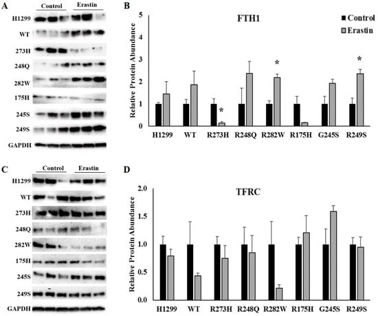 Erastin treatment differentially affects TFRC and ferritin heavy chain 1 (FTH1) protein expression in cells expressing distinct TP53 mutation types. Representative images and quantification of Western blots examining the expression of (A,B) transferrin receptor 1 (TFRC) and (C,D) ferritin heavy chain 1 (FTH1) in TP53 null H1299 cells (H1299) or H1299 cells transfected with wild-type (WT) TP53, or the indicated TP53 mutant following treatment with DMSO (control) or 10 µM erastin for 24 h (n = 3–4 per cell type and treatment). Relative expression was normalized using glyceraldehyde 3-phosphate dehydrogenase (GAPDH) as a loading control. * Denotes statistical differences from respective control, p < 0.05. Error bars indicate SEM.