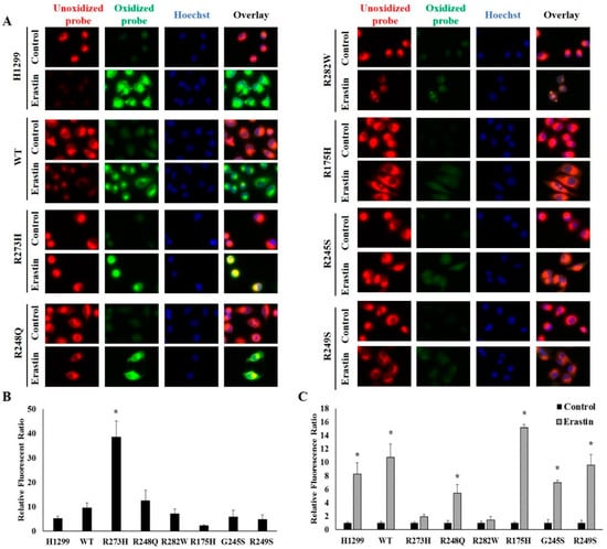 Mutant TP53 expression influences basal and erastin-induced levels of lipid peroxidation. (A) Unoxidized and oxidized C11-BODIPY in tetracycline-induced WT and mutant TP53-expressing following treatment with DMSO (control) or 10 µM erastin (Erastin) for 24 (n = 3–4 per cell type and treatment). (B,C) Changes in relative amounts of oxidized probe were quantified using ImageJ software following normalization to Hoechst nuclear staining to account for differences in cell number. (B) Student’s t-tests were used to identify statistically significant erastin responses relative to their controls within a given cell type. Relative fluorescence ratios for erastin-treated cells are shown normalized to the relative fluorescence ratios of their respective controls. * Denotes significant difference from control. (C) A one-way between-subjects ANOVA identified a significant effect of TP53 mutation type on basal oxidized probe at the p < 0.05 level for the 8 cell types (F (7,16) = 13.563, p < 0.001). * Post hoc comparisons using the Tukey LSD test indicated that basal levels of lipid peroxidation in the R273H-expressing mutants was significantly different from the WT TP53-expressing cells (p < 0.001). All images were acquired using a 100X objective under immersion oil. Error bars indicate SEM.