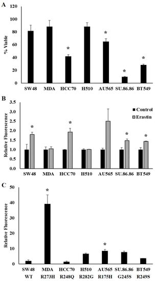 Cancer cells are extravagant users of iron, and as such, much effort has been devoted to taking advantage of cancers cells’ “iron addiction” by restricting iron availability (reviewed in [,,]). However, these approaches are confounded by the essential nature of iron for noncancerous cells as well. Ferroptosis has been described as a novel approach to exploiting the toxic nature of iron to promote programmed cell death, but the toxic potential of iron for all cell types must be considered. Thus, we sought to investigate the potential to exploit the frequency of TP53 mutations in human cancer to more favorably induced iron-mediated cell death in tumors harboring these mutation types.