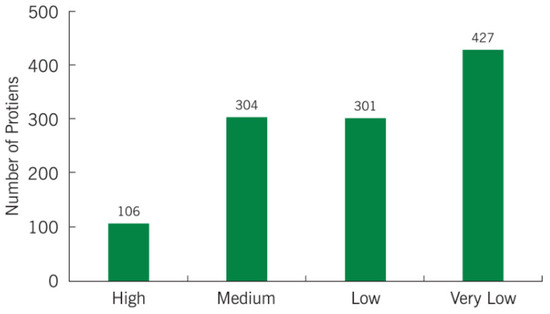 The data were analyzed using all collision-induced dissociation spectra collected in the experiment to search the National Center for Biotechnology Information (NCBI) human reference sequence database with the search programs MASCOT (Mascot version 2.7; Matrix Science, Boston, MA, USA) and Sequest (Sequest version 1.4, ThermoScientific, San Jose, CA, USA) to detect the proteins present in the in-gel digestions. The results from both search programs were uploaded into the Scaffold (version 4.0.6.1, Proteome Software, Portland, OR, USA). Protein abundance was sorted as very low, low, medium, and high, depending on the number of spectral counts (SpC), while the DEPs were categorized as underexpressed, overexpressed or uniquely expressed in a particular group, based on the normalized spectral abundance factor (NSAF). Depending on the protein abundance, different p-values were taken into consideration: (a) very low abundance: SpC = 1.7–7; p ≤ 0.001; NSAF ratio ≥ 2.5 for overexpressed, ≤0.4 for underexpressed proteins; (b) low abundance: SpC = 8–19; p ≤ 0.01; NSAF ratio ≥ 2.5 for overexpressed, ≤0.4 for underexpressed proteins; (c) medium abundance: SpC = 20–79; p ≤ 0.05; NSAF ratio ≥ 2.0 for overexpressed, ≤0.5 for underexpressed proteins; (d) high abundance: SpC > 80; p ≤ 0.05; NSAF ratio ≥ 1.5 for overexpressed, ≤0.67 for underexpressed proteins.