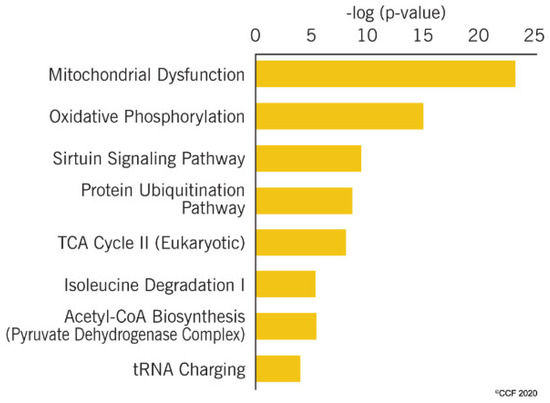 Higher -log (p-value) indicates the dysfunction of the corresponding pathways due to the involvement of differential expressed proteins. The figure shows that mitochondrial dysfunction, oxidative phosphorylation and Sirtuin signaling pathway, protein ubiquitination pathway, tricarboxylic acid (TCA) cycle II, isoleucine degradation I, acetyl-CoA biosynthesis and tRNA charging are the top canonical pathways affected in cancer group.