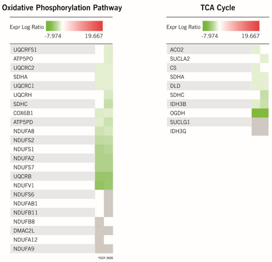 Heat map illustrating the expression of proteins associated with oxidative phosphorylation and tricarboxylic acid (TCA) cycle. Intensity of the color corresponds to the expression level of the proteins.