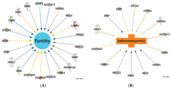 Differentially expressed proteins associated with (A) fertility potential and (B) motility of sperm in the cancer group in comparison with fertile men.