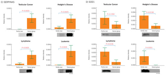 Four key proteins, NADH:Ubiquinone oxidoreductase core subunit S1 (NDUFS1), cytochrome b-c1 complex subunit 2 (UQCRC2), SERPINA5 and superoxide dismutase 1 (SOD1), were validated using Western blot in different cancer types, such as testicular cancer, Hodgkin’s disease, leukemia, and lymphoma, in comparison with fertile men (Supplementary Figure S1). The analysis revealed the underexpression of NDUFS1 and UQCRC2 in all the cancer types compared to the fertile men (Figure 6A,B). SERPINA5 was significantly overexpressed in testicular cancer, Hodgkin’s disease, and lymphoma groups (Figure 6C), while SOD1 was underexpressed in leukemia and lymphoma cancer compared to fertile men (Figure 6D). In the case of Hodgkin’s disease and testicular cancer, SOD1 expression was comparable with fertile men (Figure 6D).