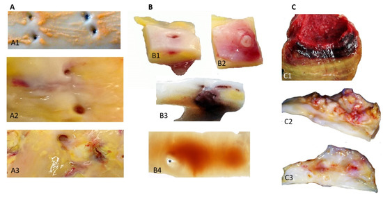 Macroscopic view of hemorrhages in human arterial lesions: (A) involvement of RBCs in the initial stages of human atherosclerotic lesions ((A1) aortic fatty streaks in human aorta and their relationship to intercostal ostia; (A2) fibro-atheroma with limited subintimal bleeding; (A3) more advanced lesions with numerous small hemorrhages and intimal breaches); (B) 0stial hematoma ((B1) ostial luminal view; (B2) outside collateral view; (B3) longitudinal trans-ostial section showing the local diffusion of the hematoma; and (B4) whole-mount immunostaining of Glycophorin A in peri-ostial clarified aortic tissue showing the hematoma diffusion from the ostia (*)); and (C) ILT in AAA and aortic valve; (C1) the multilayered intraluminal thrombus (ILT) of human AAA, where the most luminal layer (red) is extremely rich in RBCs and the subjacent layers are yellow/brown, demonstrating the release of heme and ferrous iron, and the metabolism of hemoglobin into bilirubin; (C2) aortic view of a calcified aortic valve, with peri-calcification hemorrhages (red), where the macro-crystallized calcifications protrude from the fibrosa; and (C3) view of the ventricularis of the same valve where the ventricularis surface is smoother than that of the fibrosa and the neo-angiogenesis network is visible (red)).