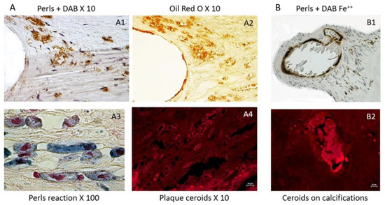 Histological views of tissue hemolysis in human aortic plaques and valves: (A) atherosclerosis ((A1) Perl’s + DAB staining of redox-active Fe++ in the shoulder of an atherosclerotic plaque; (A2) ORO lipid staining, colocalizing with Fe++ on a serial section; (A3) high magnification of foam SMCs by Prussian blue precipitation, showing the presence of Fe+++, potentially linked to ferritin (redox-inactive); and (A4) autofluorescent (550-nm wavelength, red) ceroid rings in an atherosclerotic plaque); and (B) calcified aortic valves ((B1) a crown of ferrous iron around calcification in an aortic valve, suggesting a compliant mismatch between the solid calcification and the soft elastic valve tissue; and (B2) red autofluorescence (550-nm wavelength) directly associated with aortic valve calcification).