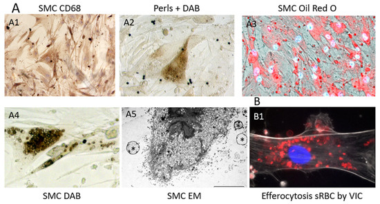 Phagocytosis of senescent RBCs by cultured human SMCs: (A) SMCs exposed to senescent sRBCs ((A1) acquisition of CD68, the phagolysosome functional marker of phagocytosis activity by cultured SMCs, usually used as a marker of macrophages, but not lineage-specific; (A2) acquisition of intracellular Fe++ staining; (A3) acquisition of lipid staining from sRBC membranes within SMCs; (A4) early phagocytosis of intact sRBCs, stained by DAB alone (pseudo-peroxidase activity); and (A5) electron microscopic view of efferocytosis of sRBCs by cultured human SMCs with the presence of extracellular RBC skeletons (*), containing hyperdense bodies, potentially iron and extracellular release of numerous micro-vesicles and exosomes by the sRBC-phagocytic SMCs); and (B) valvular Interstitial Cell (VIC) ((B1) efferocytosis of sRBCs (red) by human VIC).
