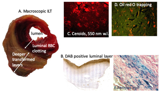 RBC-dependent oxidative stress in AAA: (A) macroscopic luminal view of the thrombus, with a predominant RBC fresh clotting at the interface with circulating blood; (B) diaminobenzidin (DAB) staining of RBC in the most luminal layer; (C) autofluorescent ceroids (550 nm), the wavelength of Hb; (D) oil red O staining of lipids (orange color); and (E) Perl’s blue staining of Fe+++, the storage redox inactive form of iron, bound to ferritin and transported by transferrin (recycling).